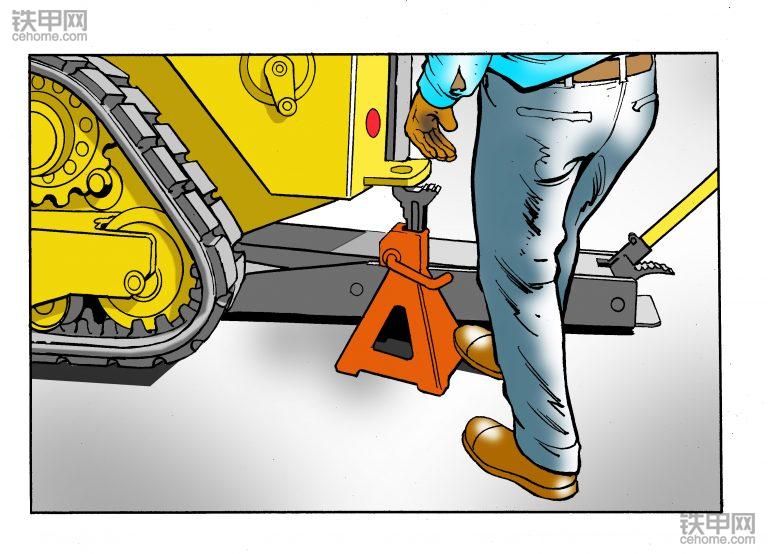 第一步:抬起设备。利用千斤顶抬起装载机的一侧,在机器的前后都要放合适的千斤顶。